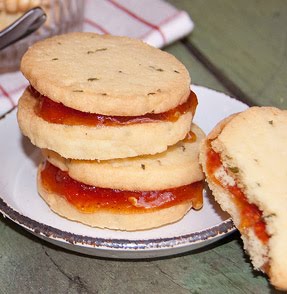 rosemary_cookie Being a cookie freak, I follow a little rule about adding at least a couple new cookie recipes to my repertoire every year. This year I’ve discovered one that is not only a keeper, but that has zoomed to the top of my favorites list. It’s fragrant, eye-catching, and on the novel side to say the least. In fact, it’s a sandwich cookie that features fresh chopped rosemary leaves, cornmeal, and a tomato jam filling!