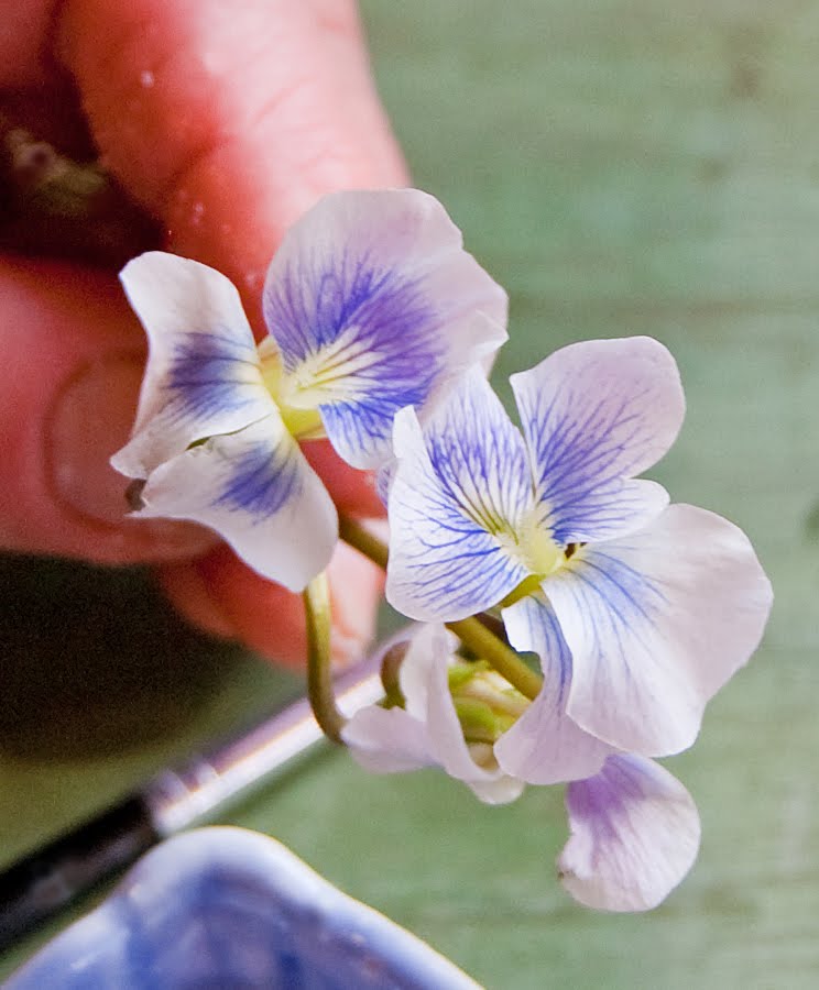 Once they are washed and patted dry, it’s possible to preserve, or “candy,” violets or their kin so they can be held and used like regular pastry decorations (as shown at left and at the top). This involves simply coating the petals on both sides with egg white, then sprinkling them evenly with superfine granulated sugar. (This can be made by grinding regular sugar in a processor until very fine.) I dip each flower into the egg white very lightly on both sides, then use a small paint brush to cover any spots missed. Then, I use a spoon to scoop sugar on one side and then another.