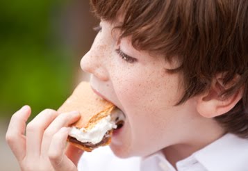 We made s’mores after our Mother’s Day supper this year. I think you can tell who liked ‘em best, though truthfully, the grownups munched theirs enthusiastically, too!Can you tell from the pic below that we used the new jumbo marshmallows that are now on the market? They are huge, and at first I thought excessive, but since I like extra-gooey s’mores, the higher ratio of marshmallow actually appealed to me greatly.