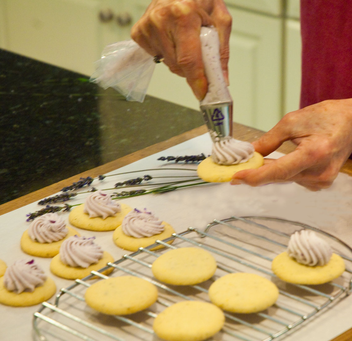 Since my cookie story is for a garden magazine, I featured flowers. Maybe you guessed from the lavender spires at the side in the pic (right) that I was piping a lavender buttercream frosting. The crew liked it a lot, by the way!
