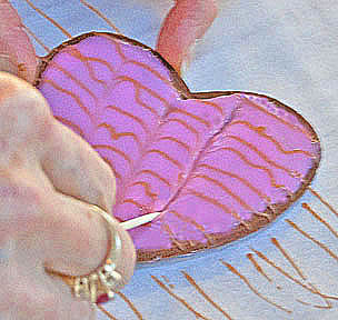 In smaller heart cookies three vertical lines is enough to dress up the entire surface. However, five marbling lines looks great on larger cookies. The only real key to success is to finish working while the two icings are still wet enough to blend and flow together and dry with a smooth surface. (If you are curious about how to create the little heart designs on several cookies pictured below, the how-to for this slightly different marbling technique is here.)