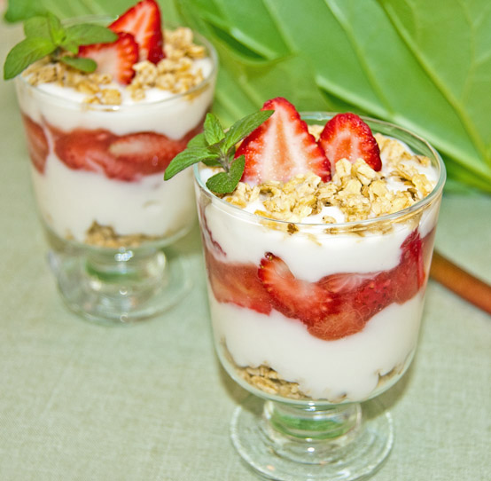 Using parfait glasses or other clear dishes or individual bowls, neatly layer the ingredients as shown or as desired. Top with strawberry slices and mint, if desired. May be made an hour or two ahead, then refrigerated, if desired. (Don’t store much longer, as the layers will begin to bleed together.)