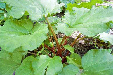 Most sources say the rhubarb stalks should be at least 1/2 inch diameter and 10 inches long before they are pulled. (Those at left are not quite big enough; those below right are about 1/2-inch.) Yes, that’s right–you’re supposed to pull the stalks away from the crown, not cut them. (Look closely at the ends of the two stalks shown below.)