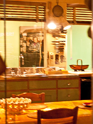 The only current drawback to photographing the kitchen interior from the outside is that all the windows are covered with very reflective, flexible plastic, and the light inside is uneven in spots. These produced the glare, bright color, and slight distortions in the images posted here.
