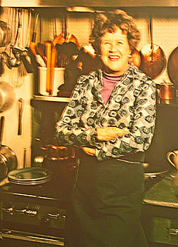 I was personally thrilled to notice that in the pic at left, Julia’s counter contains a cobalt blue KitchenAid mixer. My countertop contains a similar model in exactly the same color and of similar vintage. (Now pausing for a moment to savor the swell of pride and feeling of kinship with her!) I actually knew her; for my memories go here.