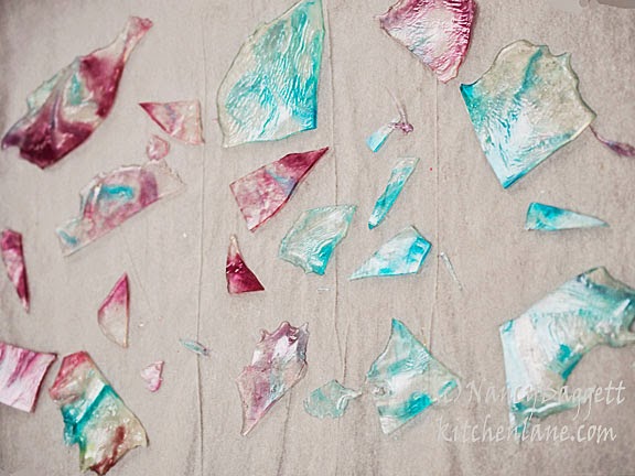 Let the sheet of candy cool on a rack until completely hardened. Then peel it off the foil and break it with your hands into whatever size shards you wish, as shown at right above. Any left-over pieces can be packed airtight and stored in the refrigerator for up to a year. Or melt them down again and produce another sheet and more shards.