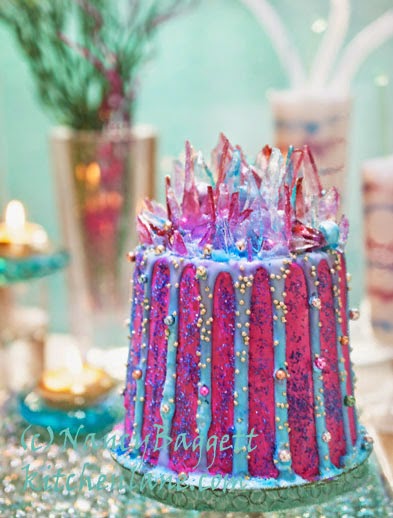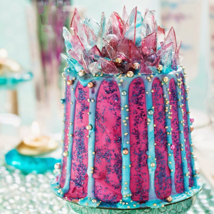 For the best selection of sparkling sugars, edible glitter, and shiny balls and decors, look in the cake decorating section of discount department and craft stores. And for the most extraordinary effect, apply them in abundance. As for the fantastical final touch, the spiky glass-like crown of candy shards on the cake top–it’s surprisingly simple to make, too. Really!